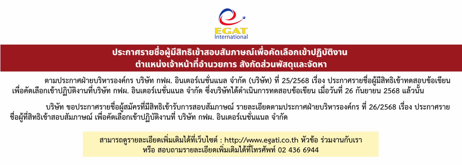 - ประกาศรายชื่อผู้มีสิทธิเข้าทดสอบข้อเขียนเพื่อคัดเลือกเข้าปฏิบัติงานตำแหน่งเจ้าหน้าที่บัญชีอาวุโส ดำรงตำแหน่งผู้จัดการบัญชี ปฏิบัติงานประจำที่ บริษัท NNP1PC ณ สปป.ลาว จำนวน 1 อัตรา และเจ้าหน้าที่อำนวยการ สังกัดส่วนงานคณะกรรมการ จำนวน 1 อัตรา